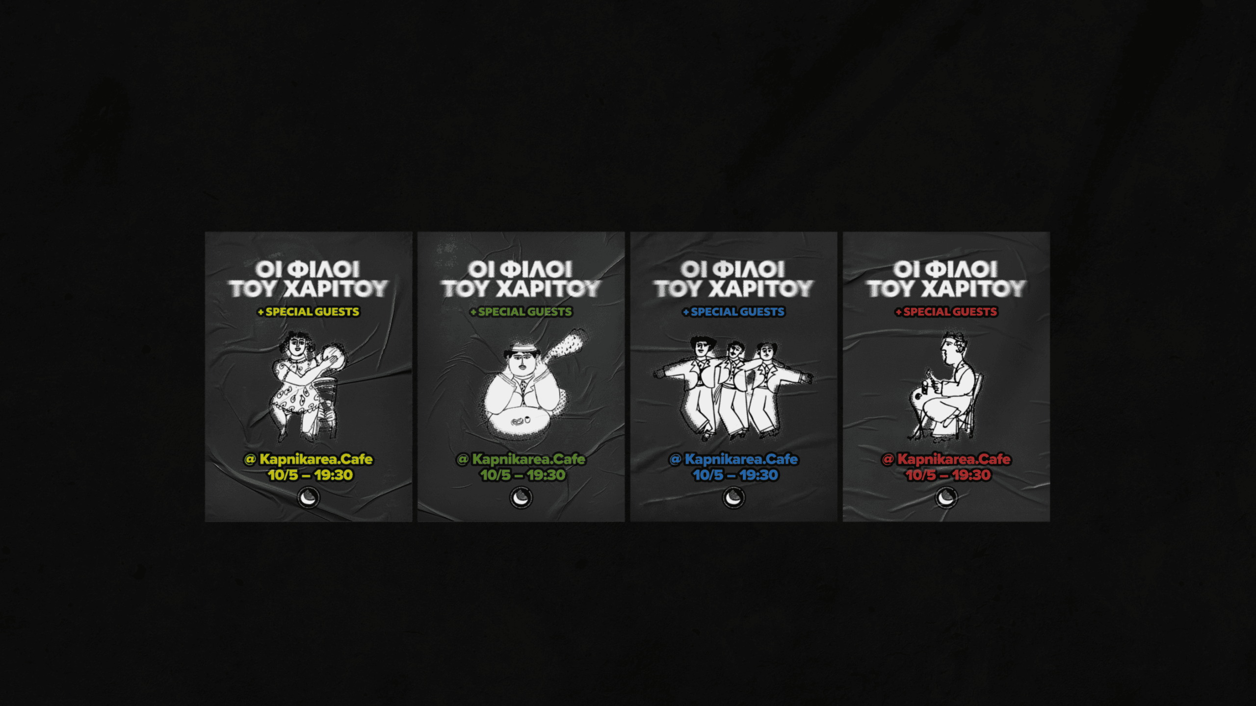 The project involves designing communication material for the music band “Charitos’ Friends”. With the aim of promoting the afternoon performance held every Friday at 7:30 p.m. at Kapnikarea Café, a set of materials was designed to reflect the atmosphere of the show. Based on the image and overall aesthetic of the band, a visual system of colors, font combinations, and key visuals was created, which were then applied to posters, advertising banners for social media, profiles on social networking platforms and various other visual communication materials.
